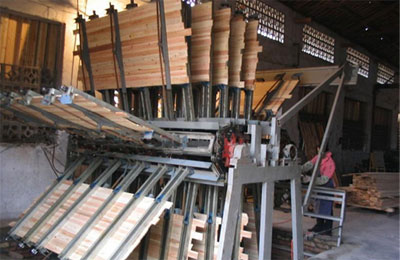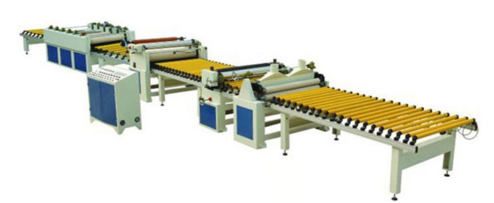 板料进入前经过吸尘,涂胶后贴木皮警告过加热加压,以增强木皮的牢固性。